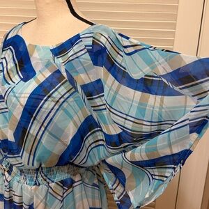 Calvin Klein Chiffon Kimono Dress in a Plaid Pattern of Blue and Tan and Green