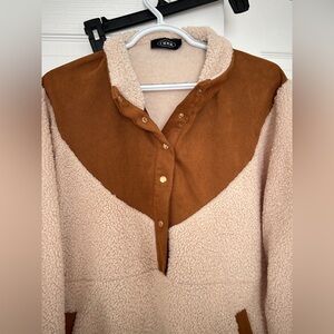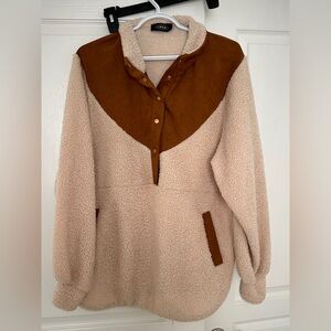 Tan + brown Sherpa fleece pullover with button-up collar and pockets