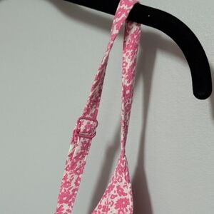 Stylish pink dress with a floral pattern. Ideal for casual wear. Adjustable straps. Smocked backing.