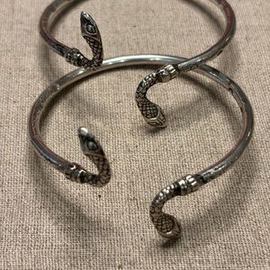 Elevate your jewelry stack with this captivating pair of matching snake bypass bracelets. Crafted from high-quality sterling silver with a beautifully aged patina, these bangles feature a bypass design where two serpent heads meet in an elegant, symbolic embrace.