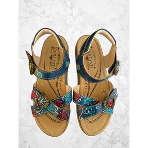 Beautiful L’Artiste by Spring Step genuine leather floral sandals in size 38 (fits US 7–7.5). Blue leather with multicolor embossed floral design and decorative buckle detail. Cushioned comfort footbed.