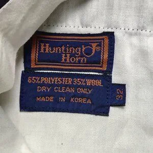 Classic Hunting Horn vintage slacks in black featuring a wool blend construction and traditional pleated front. Men’s size 32 with an unhemmed inseam, allowing for custom tailoring to your preferred length. Timeless dress pant styling perfect for formal, business, or retro-inspired looks.