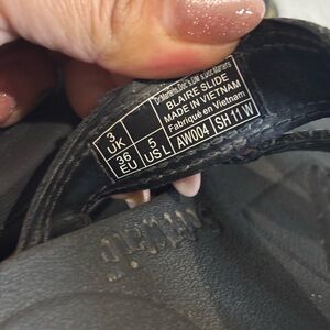 Stylish black sandals with adjustable silver buckles. Features a chunky sole for comfort and durability. Perfect for casual wear.