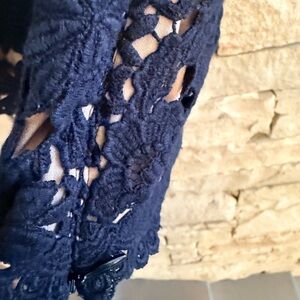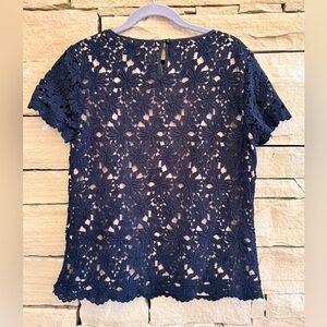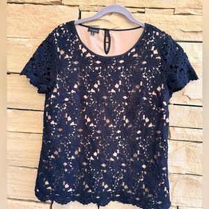 Elegant Black Cotton Lace Talbots Top with Nude Lining. Cap sleeves