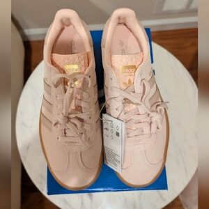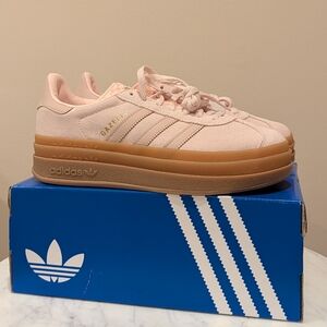Brand new Adidas gazelle bolds! So versatile and can be worn with any outfit. suede light pink and slightly darker pink leather stripes.