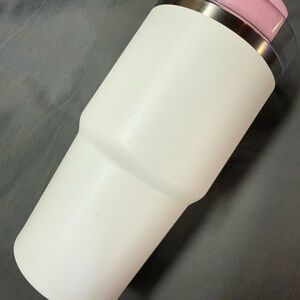 Stylish Stanley tumbler. White body with pink highlights. Ideal for beverages.