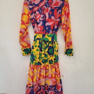 Embrace a vibrant explosion of color with this stunning Boden maxi shirt dress. Crafted with a tiered skirt and a matching self-tie waist belt, this piece creates a flattering, feminine silhouette that moves beautifully. The bold, oversized floral print in primary hues is sure to turn heads, while the crisp collar and button-down front add a touch of classic sophistication. This dress is in excellent condition, appearing brand new without tags. Perfect for a garden party, a summer wedding guest look, or a stylish brunch