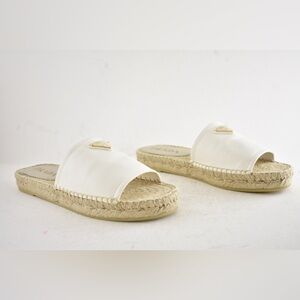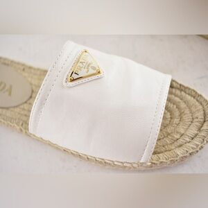 Prada Gold Triangle Logo Avorio White Leather Espadrille Slide Sandal Flat 37