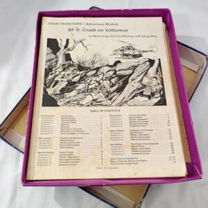 Contains Crash on Volturnus module, full-color maps and 285 counters (complete sheet). Missing rule book and dice. Maps in great condition for age. Counters mainly unpunched. Box shows multiple spots of wear, taped edges, etc. These issues have been taken into consideration regarding pricing. Please see pictures and video.