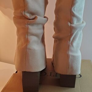 Step out in style with these gorgeous elegant cream scrunchy soft suade boots. Perfect for any occasion, they offer both comfort and fashion. Fit most calves, block heel 2.95"
