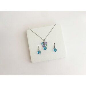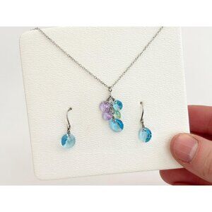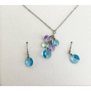 Swarovski crystal set of earrings and a pendant necklace. Earrings are blue colored and the pendant is blue, green and purple on a sterling silver chain. Comes with the original box.