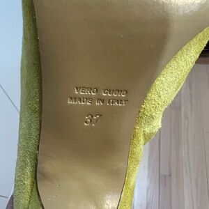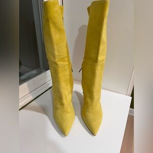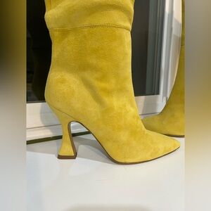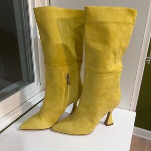 Chic yellow suede boots. Slightly slouchy style, curved heel and side zip. Perfect for making a bold statement. Great for spring as a pop of color!