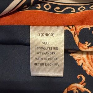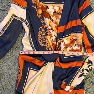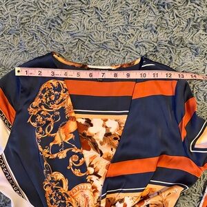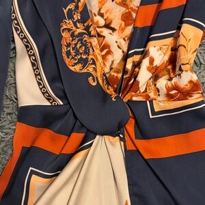 Design: Vibrant multi-color baroque/floral print in navy, burnt orange, and cream.