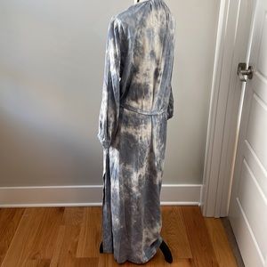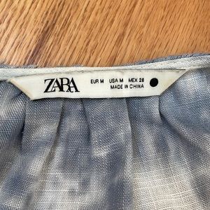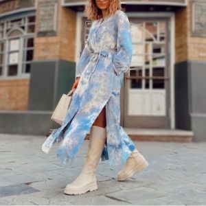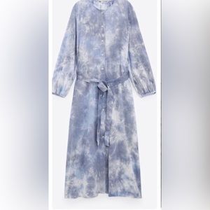 EUC Zara Linen Blend Tie Dye Dress. Blue and white cloud like pattern. Button up front, long sleeves and side slit. Length approximately 48 inches. Waist tie belt is removable.