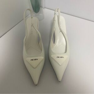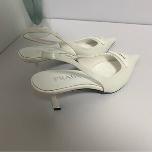 Chic Prada slingback heels in a sophisticated cream shade. Ideal for elevating any outfit.