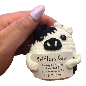 Adorable Selfless Cow plush toy in classic black and white. Perfect for cuddly companions. Encourages positive messages and imaginative play.