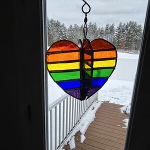 Brighten your home with this stunning rainbow stained glass heart suncatcher. Perfect for adding a splash of color to any room. Handmade and on spinning hook, silver solder.