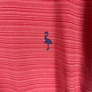 TailorByrd Performance quarter-zip pullover features a vibrant cherry red micro-stripe pattern with a signature blue flamingo logo embroidered on the chest. This technical top is engineered for comfort and utility, offering moisture-wicking properties, quick-dry technology, and SPF 30 sun protection. The lightweight, stretchy fabric ensures a cool, smooth feel, making it an ideal layer for golf, active outings, or casual weekend wear.