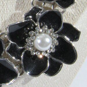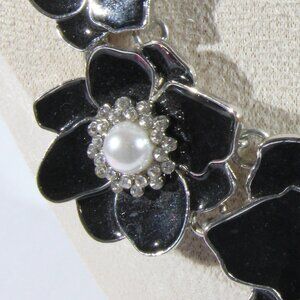 Elegantly designed silver-tone necklace adorned with striking black flowers, delicate faux pearls, and sparkling clear rhinestones. This exquisite necklace is in remarkable condition, adorned with dazzling rhinestones that catch the light beautifully.