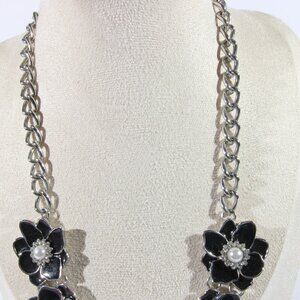 Silver-Tone Necklace with Black Flowers with Faux Pearls and Clear Rhinestones