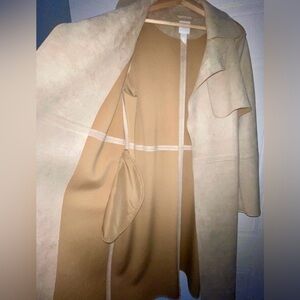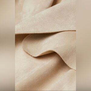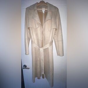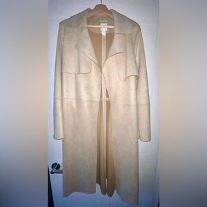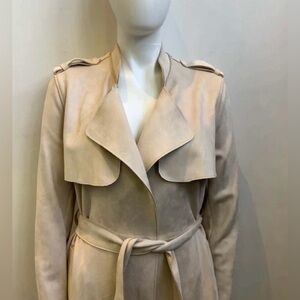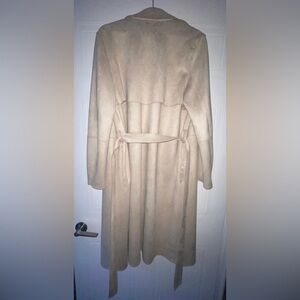 Never worn, in excellent condition. Tag says size US M for oversized wear but also fits sizes US L/XL for true to size fit. Light cream/beige color. Soft, stretch imitation suede with a small standup collar, soft lapels and fixed shoulder tabs. Loose yoke front and back, side pockets and a detachable tie belt at the waist. No fasteners. Unlined. 44 inches in length.