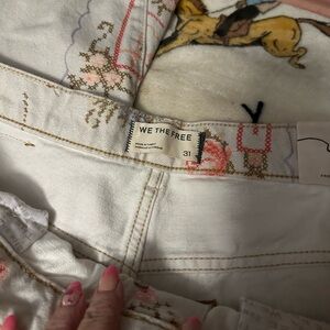 Stylish wide leg jeans with floral pattern. White base with pink accents. Perfect for a trendy look. Brand new never worn my loss your gain.