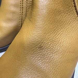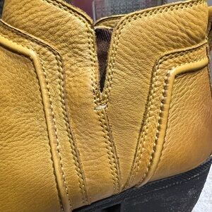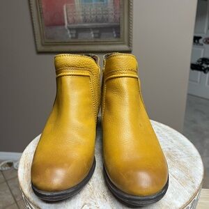 Cobb Hill by Rockport…stylish golden leather ankle boots with a sturdy heel. Perfect for versatile wear. V cut notched outside with inside zipper…2” heel…cushioned footbed… interior plaid trim… cute bootie….beautiful soft leather….there is a small discoloration on the left boot as seen in photo and slight wear on heel…