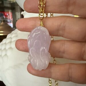 Carved lavender jadeite jade pendant & gold tone chain