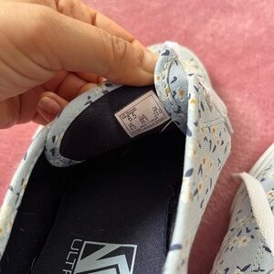 Stylish Vans sneakers with a floral pattern. Light blue canvas with white laces. Perfect for casual wear.