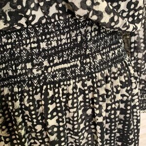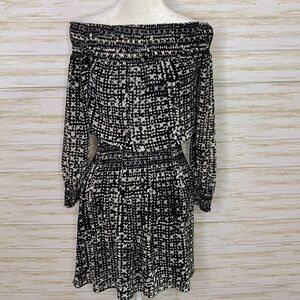 MICHAEL Michael Kors off shoulder dress. Black 100% polyester with ivory abstract dots. Elastic shirring at neck, waist and sleeve. Pullover style. Body of dress is lined. Womens size Small. Great used condition.