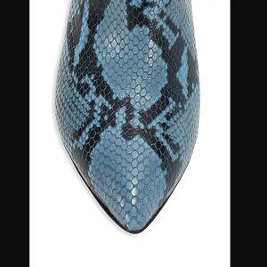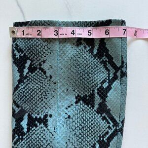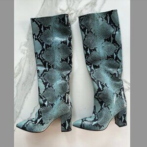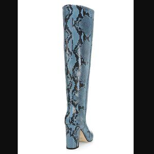 Stylish blue snakeskin pattern. High block heel. Knee-high design. Perfect for a bold look.