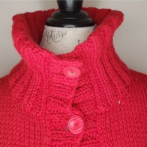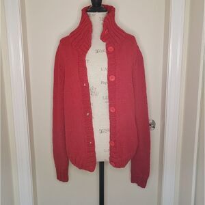 Classic vibrant cherry Red thick Handknit High Cowl Neck Buttonup Long Sleeve Cardigan Sweater.