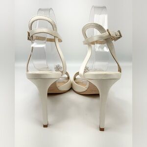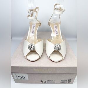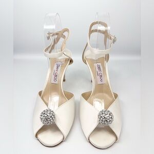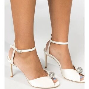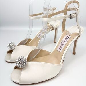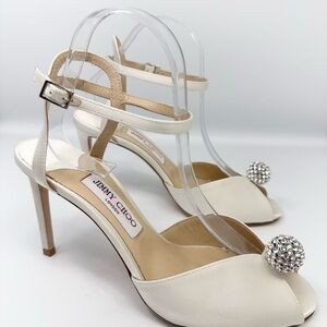 Jimmy Choo Sacora 85 Ivory Satin Sandals with Crystal-Embellished Sphere