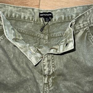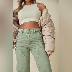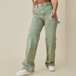 New Without Tags PrettyLittleThing Women's Washed Olive Green Seam Detail Panel Straight/Wide Leg Cargo Jeans, Size 8. Trendy olive cargo trousers with utility pockets. Ideal for everyday style. These acid washed jeans are sure to become your new go-to on your off-duty days. Unique seam-detailed panels, rigid denim and a straight-leg fit, what's not to love? (Official description calls them "straight leg" but I think they are more like a wide-leg fit see photos. Doesn't matter what you call them, super cute either way!) These jeans are so easily styled for any occasion or plans, so what are you waiting for? Add a basic crop top, bomber jacket and chunky sneakers for an off-duty look that is sure to impress. MSRP $75 Never worn. Sales tag fell off, but the string is still attached. Cute & stylish jean that would be a great addition to switch up the common look. 100% cotton. Approximate measurements while layinf flat - 15" across waist, 31.5" inseam, 10.5" leg opening.
