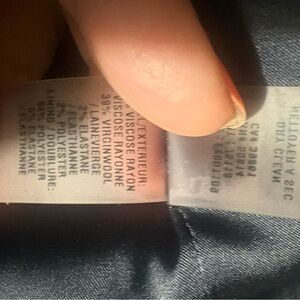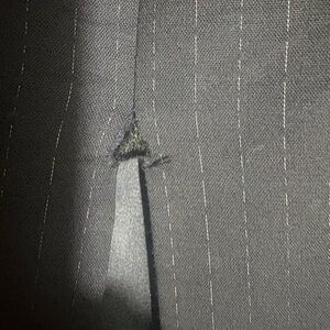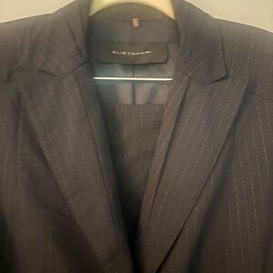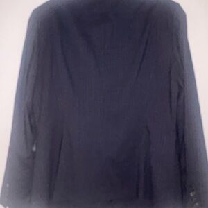 Sophisticated navy striped blue wool skirt set with sleek design. Ideal for professional settings. Last picture shows a little wear on slit.