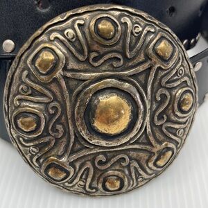 Retro Southwestern Studded Leather Belt Ornate Silver Medallion Buckle