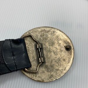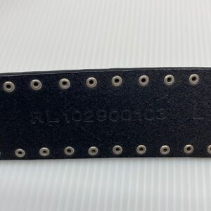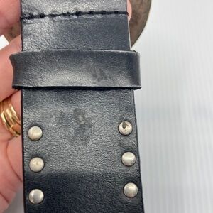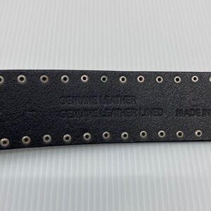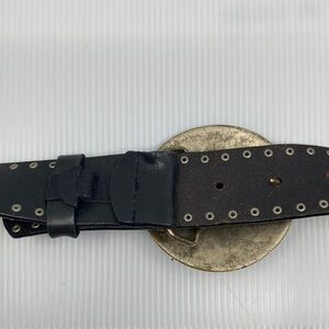 Elevate your style with this black leather belt featuring a striking silver and gold and studs. It measures from buckle to last hole approximately 35”. The third hole shows minor wear use and there is a flaw in the leather near the buckle and on the belt loop as seen in pictures. However, the flaw near the buckle can not be seen if worn second hole from the end and back (pictured).