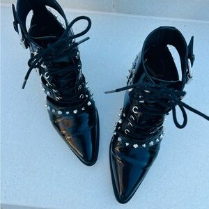 Chic black boots with lace-up design. Features bold studded accents. Perfect for a stylish edge. Worn no more than 5 times.