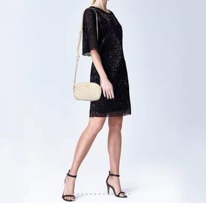 Chic quilted design with gold accents. Adjustable crossbody strap. Perfect for versatile styling. Dimension 7-3/4” x 5” x 2-1/4”.