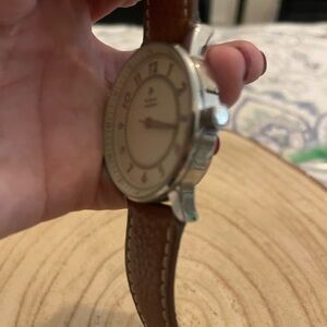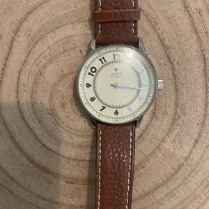 Elegant watch with a brown leather strap. Classic round face with silver accents.