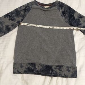 Cherokee cozy gray sweatshirt with pattered sleeves and waist band size Large. I believe this is a kids large so please see the pictures for measurements. it looks like a woman's small or medium to me. it is a nice medium weight.