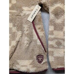 The product is a new Ariat Women's Berner Snap Front Line Ridge Print in Size XXL. It features a diamond pattern in a multicolor design with long sleeves and a pullover closure. Made of polyester and fleece, this regular fit pullover is designed for plus size women, with a classic Western cowboy style theme and lined for added comfort. Perfect for those looking for a stylish and comfortable addition to their wardrobe.