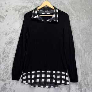 Adrianna Papell Womens Sweater Layered Look Gingham Plaid XL. This stylish long sleeve top features a black knit body with an attached gingham plaid collar and hem for an effortless layered aesthetic. Crafted from a soft viscose blend with a lightweight polyester combo.