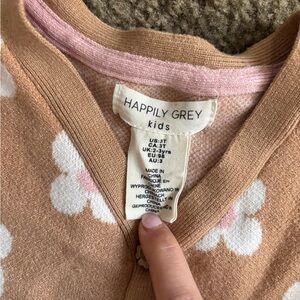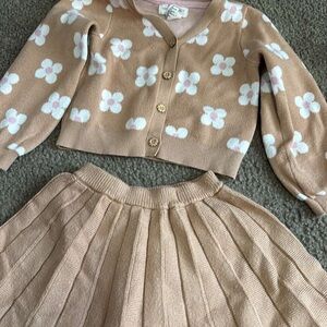 Adorable kids matching set featuring a tan cardigan with floral patterns and a matching skirt. Perfect for stylish outings.