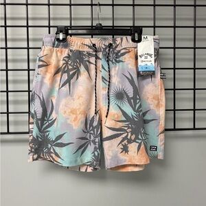 Embrace the beach with Billabong's pastel palm swim shorts. Features peach and aqua tones with a tropical print.