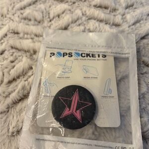 Black PopSocket featuring a pink star. Ideal for secure grip and media stand.