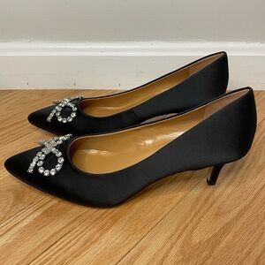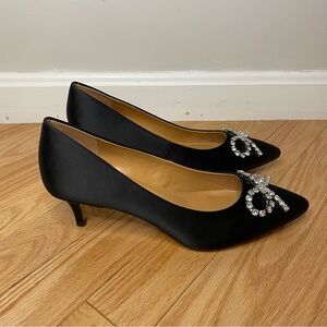 Adorable black satin kitten heels featuring pointed toe and crystal bow. Fit is true to size. Item is lightly used and in excellent condition. There are very light scuffs on the back and front and a few small stains on the back ankles (all pictured). Perfect for a formal event.