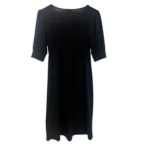 Chic black midi dress with a flattering V-neck. Features half sleeves and a comfortable fit. Ideal for versatile styling.