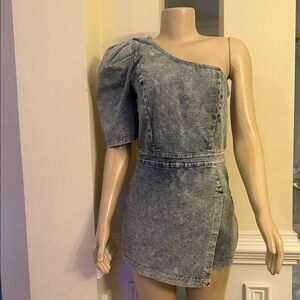 Chic denim romper with a one-shoulder design. Features a stylish puff sleeve. Ideal for casual or evening wear.