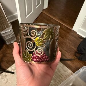 Bath & Body Works decorative 3-wick candle holder featuring a beautiful grapevine and ivy metal design. This sleeve fits standard Bath & Body Works 3-wick candles and adds a warm, elegant touch to any space.